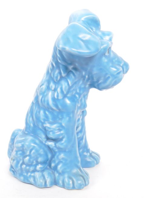 A vintage 20th century ceramic pottery figurine / statue of a terrier dog in the Sylvac manner. In a seated position, in a blue ground. No makers marks present. 27cm tall.