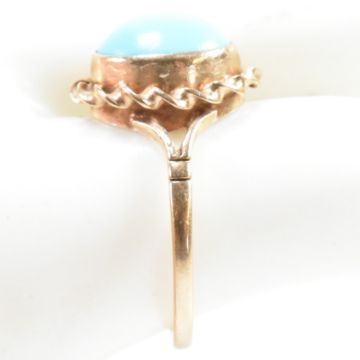 A hallmarked 9ct gold and turquoise ring. The ring having an oval turquoise cabochon set in a mount with twisted border decoration to bifurcated shoulders. Partially hallmarked for the Birmingham assay office, 1978. Surface tests indicate 9ct gold. Size K.5. Weighs 2.2g. All weights, measurements and sizes are approximate.