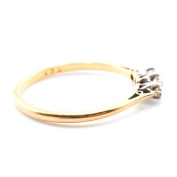 An 18ct gold and platinum diamond three stone ring. The ring having three shared claw set old cut diamonds set in a platinum mount to chenier shoulders to 18ct yellow gold shank. Marked 18C & PLAT to inner shank. Size N. Weighs 1.7g. All weights, measurements and sizes are approximate.