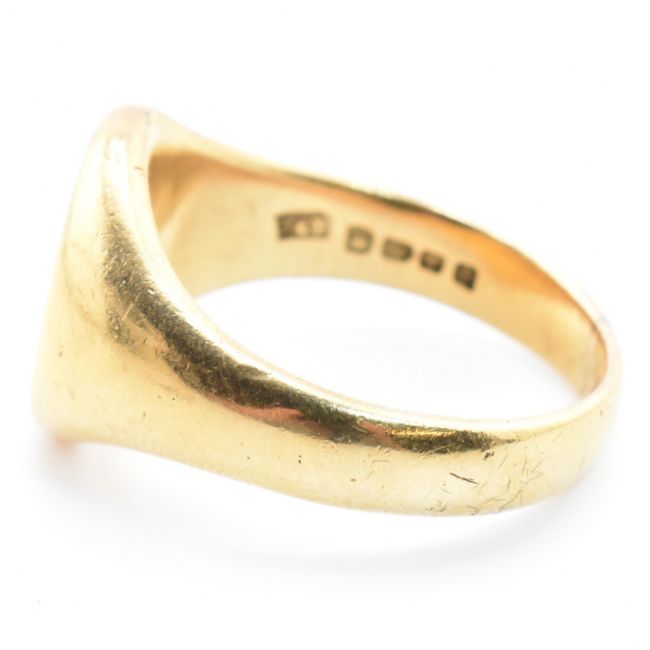A hallmarked 18ct gold signet ring. The hallmarked 18ct yellow gold signet ring having an oval head with crest and inscription 'Aime Ton Frere' to tapered shoulders. Hallmarked for London, 1920. Maker's mark C&P. Size V. Weighs 14.4g. All weights, measurements and sizes are approximate.