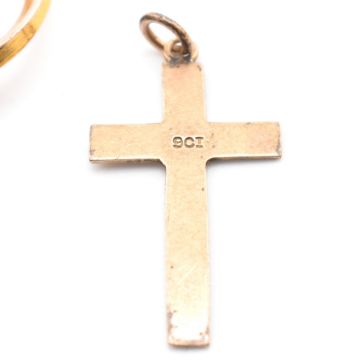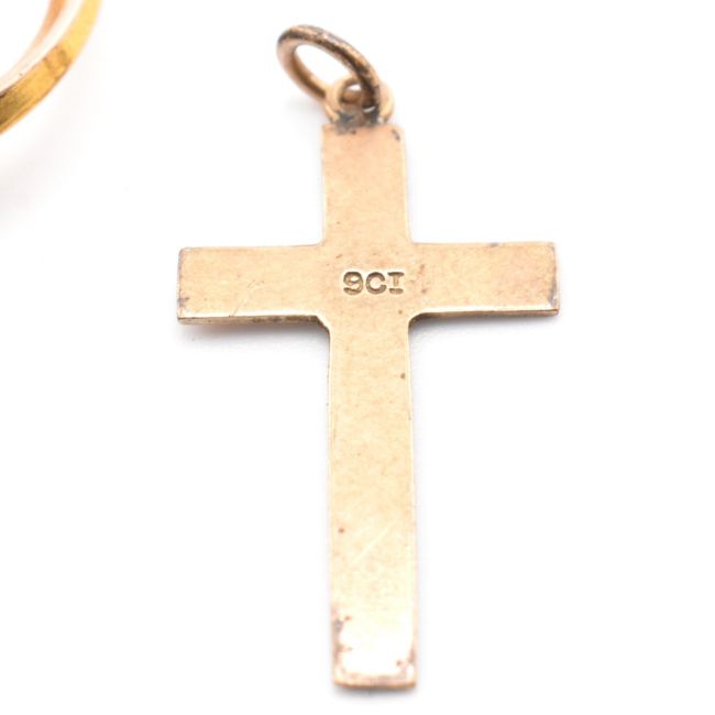 Two 9ct gold necklace pendants. The lot to include a 9ct yellow gold cross necklace pendant, marked 9ct to verso. A 9ct gold pierced bird necklace pendant, marked 9ct to verso. Cross pendant measures 2.8cm x 1.3cm. Bird pendant measures 2cm x 2.5cm (including bale). Total weight 1.45g. All weights, measurements and sizes are approximate.