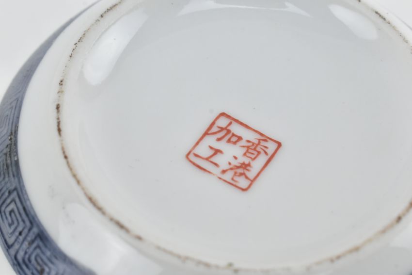 Two 1960s Chinese famille rose porcelain ginger jars. The lot comprising a globular ginger gar decorated with flowers with matching cover along with an ovoid shaped figurine ginger jar decorated with a lady in a garden. Both marked "Hong Kong final process" marked to the base. Large measures approx. 13cm tall.