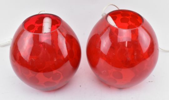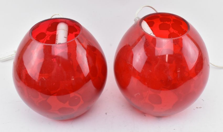 IKEA - A pair of vintage late 20th century Swedish designer etched red glass table / bedside globe lamp lights. The light shade with floral shaped detailing throughout. With hand made stickers. Sold as untested. Each measures approx. 23cm tall x 22cm in diameter