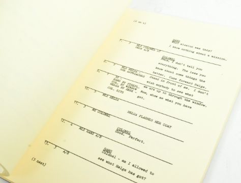 'Allo 'Allo! (BBC Sitcom 1982-1992) - Series 2 Episode 3 - original production copy of a camera script for the second series. Dated 17th May 1985. 74pp, plus Running Order pages, Cast List, cover and transmission form. Yellow paper stock. Bound, with plastic covers. Likely a 'Transmission Script' used by editors / writers to note running times and final edits, copied from an original camera script and used prior to transmission.'Allo 'Allo! is a British sitcom television series, created by David Croft and Jeremy Lloyd, starring Gorden Kaye, Carmen Silvera, Guy Siner, Richard Gibson, Vicki Michelle and an ensemble cast. Originally broadcast on BBC1, the series focuses on the life of a French café owner in the town of Nouvion, during the German occupation of France in the Second World War, in which he deals with problems from a dishonest German officer, local French Resistance, the handling of a stolen painting and a pair of trapped British airmen, all while concealing from his wife the affairs he is having with his waitresses.