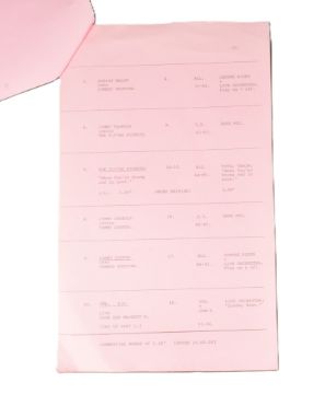 Live From Her Majesty's (April 15th 1984) - Tommy Cooper interest - an original production used Transmission Order document, detailing the timings and acts performing during the live broadcast. This particular programme is notable as it features the final appearance of Tommy Cooper, who collapsed and died on-stage during the broadcast. Cooper's appearance is noted in the No.9 slot, just before a commercial break. 6pp on pink sheets, with original pin to corner. Poignant piece of British Comedy history.