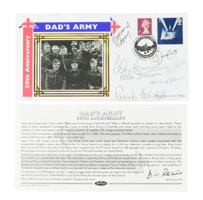 Dad's Army (BBC Sitcom 1968-1977) - a 1998 Benham Covers '30th Anniversary' officially released multi-signed FDC / First Day Cover. Depicting an image of the cast and crew, and signed by: writers David Croft & Jimmy Perry, Clive Dunn (Jones), Bill Pertwee (Hodges), Frank Williams (The Vicar), Ian Lavender (Private Pike) and Pamela Cundell (Mrs Fox). Singed in blue and black ink.