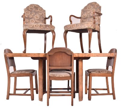 An Art Deco early 20th century circa 1930s figured walnut veneered extending dining table with six chairs. The table having a curved extending top with fitted frieze. Raised on curved base united by central stretcher. Together with four burr walnut veneered dining chairs with shaped back rest and upholstered seat. Together with pair of near matched carver chairs. Table measures approx.