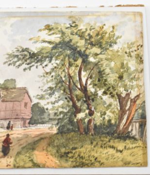 Richard Sebastian Bond (British 1808-1886) - A 19th century circa 1868 watercolour on paper painting. The watercolour depicting a village scene with houses to the left and people on road with trees to the right. Signed & dated to bottom left. Unframed, unglazed. Glued on board. Some staining around edges. Measures approx. 15cm x 23cm.