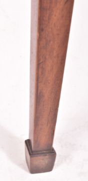 A George III late 18th century mahogany & inlaid serpentine front card table. The table having a fold out serpentine top with fitted frieze below. Shell inlaid roundels to each corner raised on squared tapering supports with block ends. Measures approx. 75cm x 82cm x 40cm.