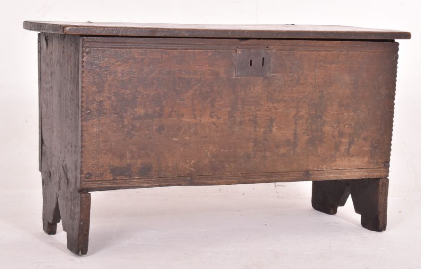 A 17th century six plank oak coffer. The coffer having a hinged lid opening to reveal a spacious interior with iron lock to the front and carved detailing to the edges. Measures approx. 51cm x 87cm x 33cm.