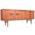 Beautility - a mid 20th century teak wood sideboard credenza. The sideboard of rectangular form having a central fall front drinks cabinet door, flanked to the left by a cupboard, and to the right by a bank of three drawers. Each having elaborate carved wooden handles. Raised on tapered supports.