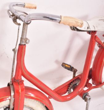 Two vintage mid century circa 1960s - 1970s children's fairground / funfair bicycles. Each bicycle in differing colourway, one in blue & one in red, with chrome bodies and white plastic and leather fittings.