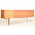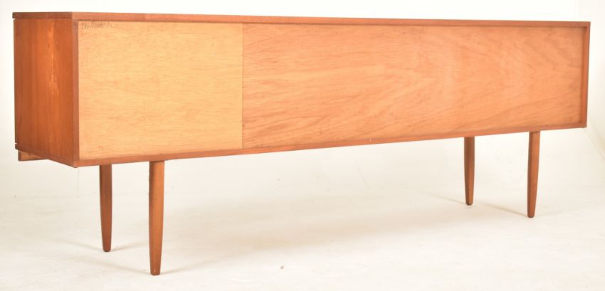 Avalon Furniture - a retro mid century teak sideboard credenza. The sideboard having a straight top over central bank of three graduating drawers with wooden pull handles. The drawers flanked by twin cupboard doors to left and single cupboard door to right. Both opening to reveal a shelved interior. Raised on tapering supports.
