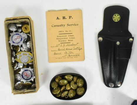A collection of assorted First and Second World War militara to include; WWI medal pair awarded to one 28148 Pte A J Herbert of the R.A.M.C Royal Army Medical Corps WWII Second World War German respirator gas mask dated 1941, Civil Defence armband, Royal Engineer should titles and uniform buttons, ARP badge, Avon Ambulance Service patches and buttons and more.