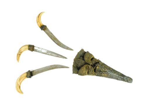 A 19th Century Sudanese Mahdist People Crocodile Head triple dagger. The crocodile head and skin scabbard set having x2 daggers with curved blades and x1 double edged straight blade with bone / horn grips. Measures approx 45cm.