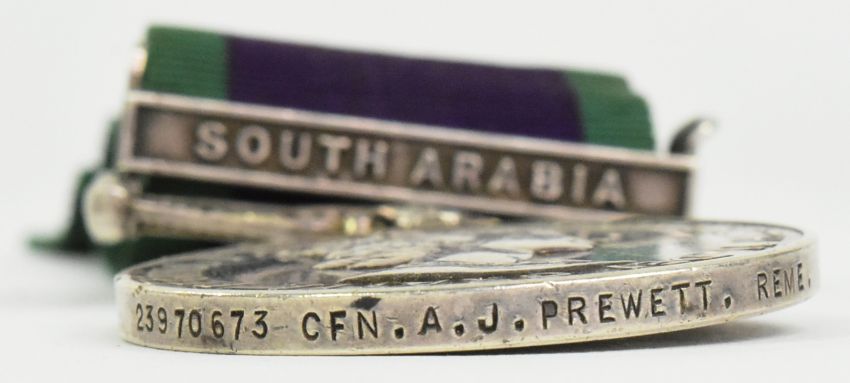 A Queen Elizabeth II General Service medal with South Arabia clasp awarded to one 23970673 CFN (Craftsman) A.J Prewett of the REME Royal Electrical and Mechanical Engineers.