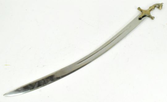 A believed early 20th Century Indian / Persian Tulwar / Shamshir sword. Horse head hilt with silver inlay and a curved blade with a single fuller. Measures approx 92cm.