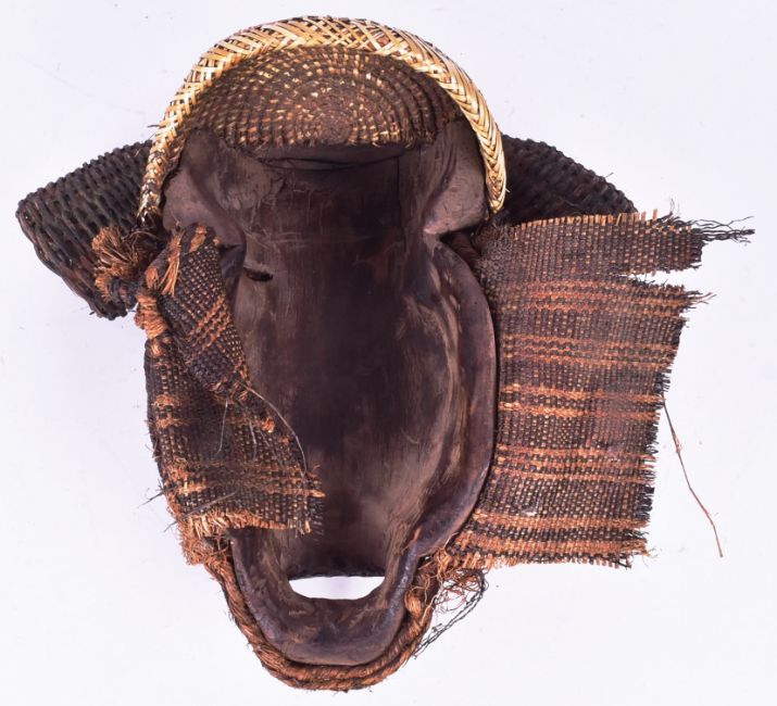 A 20th Century vintage African DRC Demographic Republic of the Congo tribal Pende mask. Wooden construction with protruding protruding eyes ad parting lips. Basketweave headdress with bell shaped rattles. Measures approx 34cm.