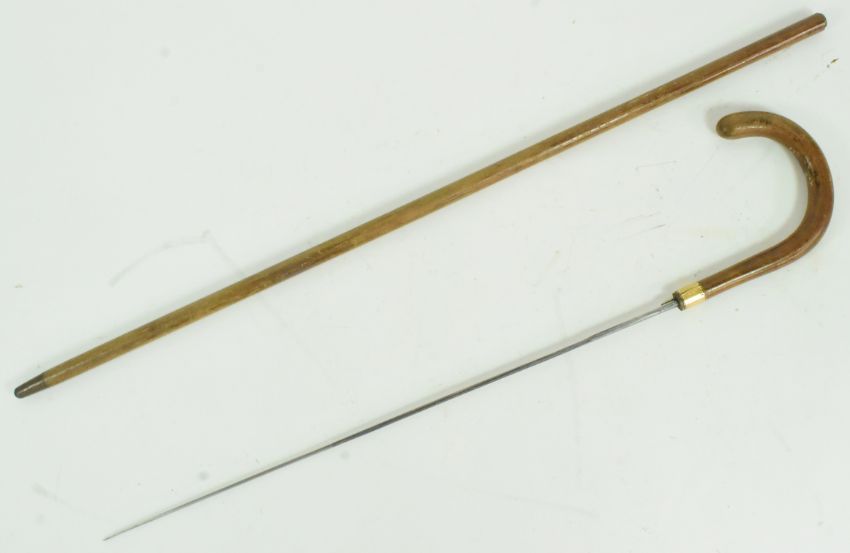 A 19th Century Victorian gentleman's sword stick with concealed Toledo blade. Crooked wooden handle with rolled gold band with small illegible hallmarks and a blue and gilt Toledo marked blade. Housed in a wooden scabbard. Measures approx 91cm.