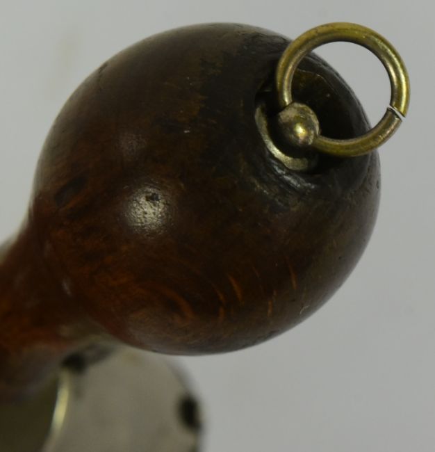 A small 19th Century novelty ink well writing compendium in the form of a revolver. Turned wood handle containing a small silver plated dip pen and the chamber holding a bullet shaped ink well. Fragile repair to the handle. Measures approx 10cm.