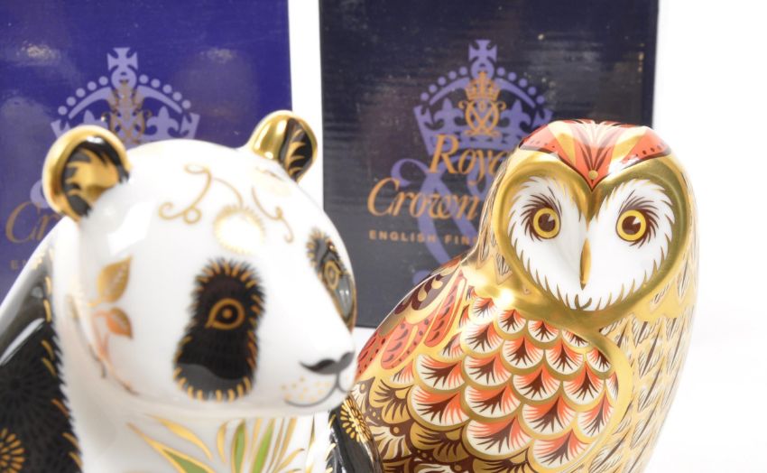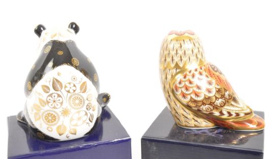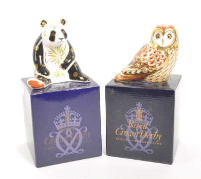 Royal Crown Derby - Two porcelain china Royal Crown Derby paperweights figures. Comprising of: Giant Panda designed by Louise Adams and signed to base in gold pen Louise Adams 26 April 2008, and Short Eared Owl an exclusive for the Collectors Guild signed to the base Louise Adams 26 April 2008. Both with gold stoppers intact to base and in original boxes.