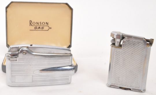Ronson / Mosda - Two mid 20th century British lighters. The collection to include a Ronson Typhoon Varaflame pocket lighter, in original box with care instructions, alongside a Mosda de Luxe lighter with engine turned body.