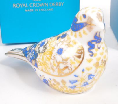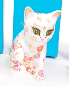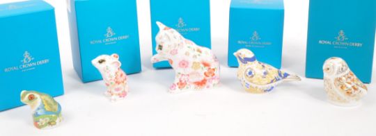 Royal Crown Derby - A collection of five small porcelain china Royal Crown Derby paperweights figures. Comprising of Dora Mouse, Flora Kitten, Red Eyed Tree Frog, Winter Owlet, and Linnet. All with gold stoppers to base and in original boxes.