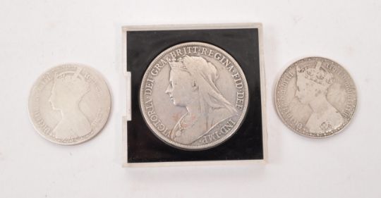 United Kingdom - A collection of three Victorian 19th-century silver coins. To include two silver florins and an 1899 silver crown. Total weight 49.6g