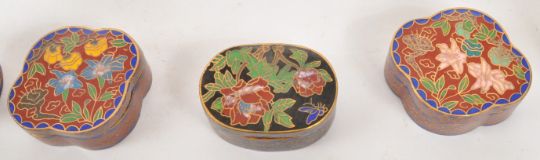A collection of x10 vintage Chinese Cloisonne enamelled trinket pots decorated with floral motifs, birds and cheery blossoms in an array of colours and gold coloure borders. Tallest measures approx 5cm.