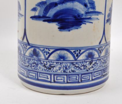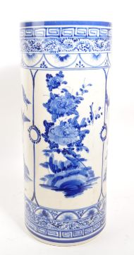 A 20th century Japanese blue and white ceramic umbrella stand. The umbrella stand of cylindrical form, with blue and white painted decoration.
