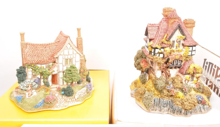 Lilliput Lane - A collection of 20th Century Lilliput Lane cottage model figures all in original boxes. Comprising of St Lawrence Church, Four Seasons, Breacow Weights, Paradise Lodge, Camomile Lawn, Anne Hathaways, Aberford Gate, Flower Sellers, Clare Cottage, Hampton Manor, Spring Bank, Strewberry Cottage, Inglewood, Curlew Cottage and Cider Apple Cottage. Largest measuring approximately 15cm x 17cm x 13cm.