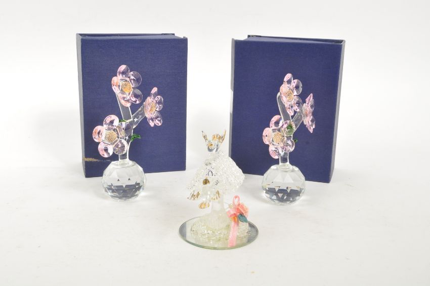 A pair of crystal glass flower figures by Balmoral Crystal. Each having circular glass base with three pink flowers to each.
