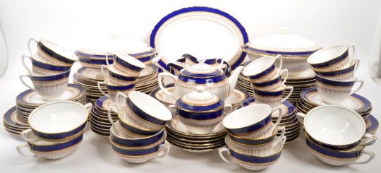 Royal Worcester - A large 20th Century porcelain fine bone china tea and dinner service by Royal Worcester in the Regency blue pattern. Comprising of teapot, 10x teacups, 4x coffee cups, 6x soup cups / bowls, saucers, 18x dinner plates, 4x smaller plates, 8x small plates, 9x small cake plates, 6x small bowls, 2x tureens, lidded sugar bowl, milk jug, and serving plates.