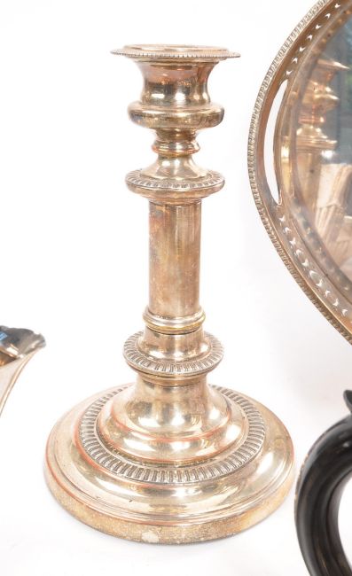 A collection of vintage 20th century silver plated items. Including teapots, entree dishes, flasks, egg stands, and gallery tray.