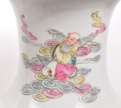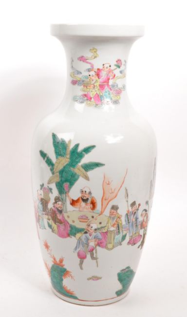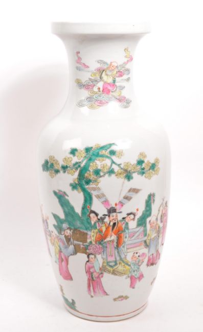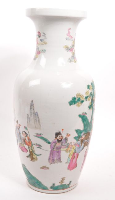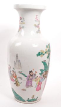 A large early 20th Century Chinese famille rose ceramic vase with hand painted oriental scenes of figures in various scenarios against a white ground.