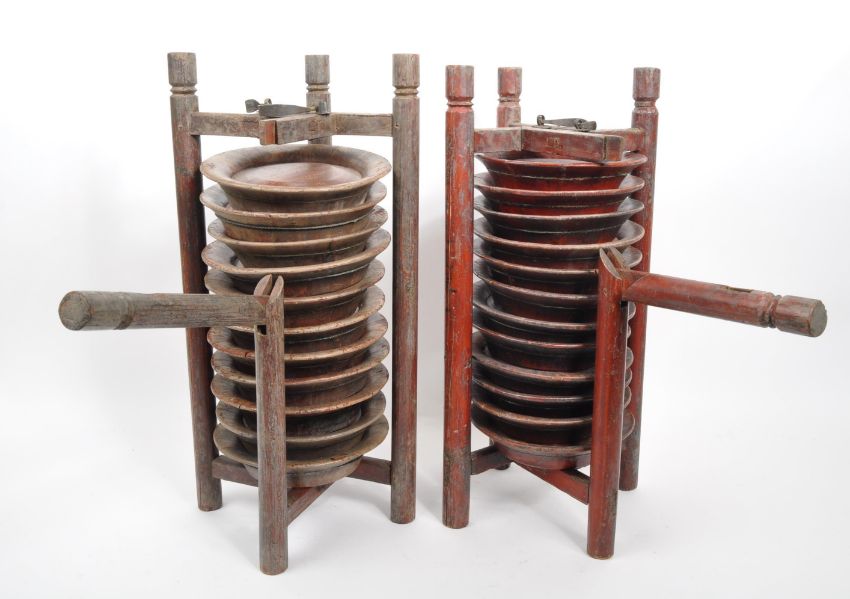 A pair of wooden Chinese plate stacking caddy racks operated by releasing one of the wooden legs to access the plates. Measures approx 50cm tall.