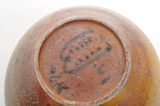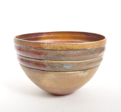 A large 20th Century studio ceramic stoneware art pottery bowl having mottled matte brown ground with purple / red glazed circular rim detail.
