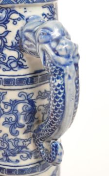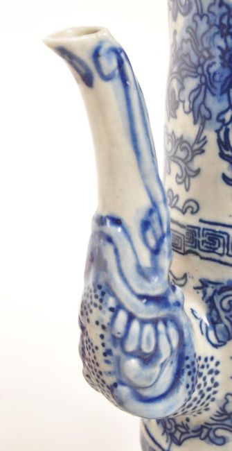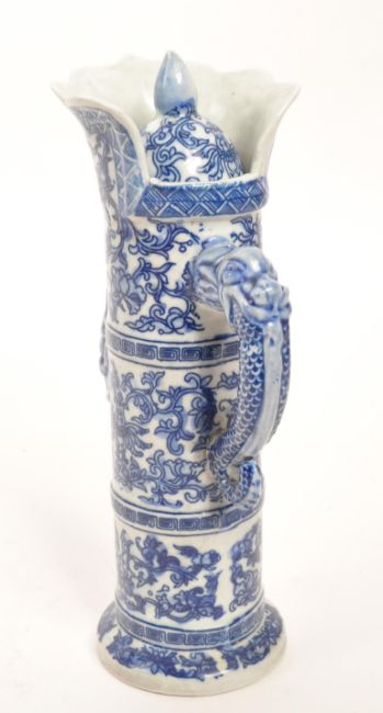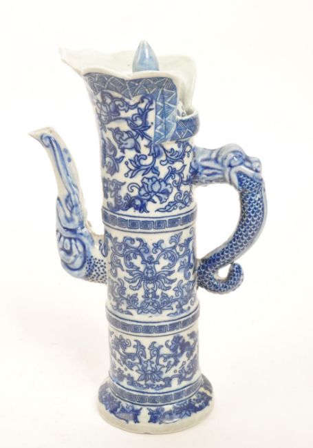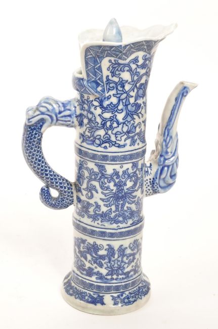 A 20th Century vintage Chinese porcelain blue and white lidded wine pot / wine jug. Having floral motif design to body with dragon handle.