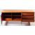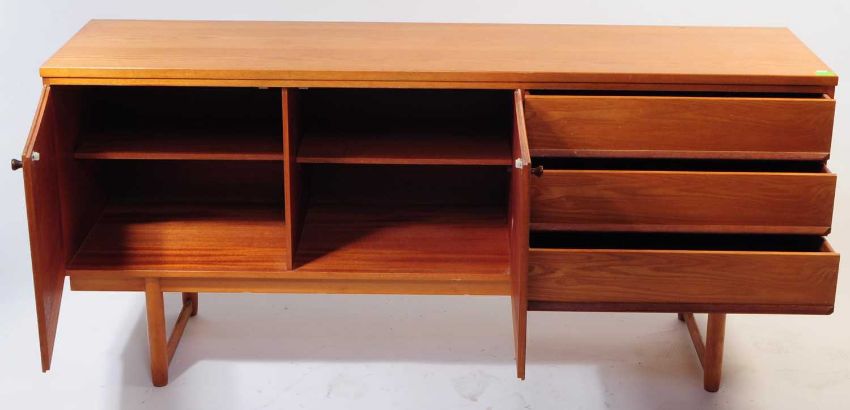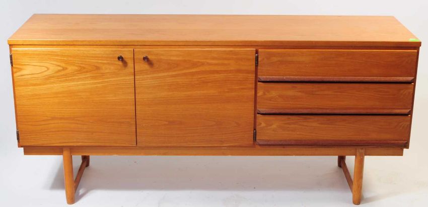 British Modern Design - A mid 20th century teak sideboard. The sideboard raised on rounded supports, united by stretchers. Having a bank of three drawers to the right, beside a twin door cupboard.