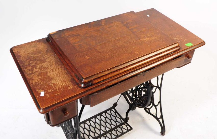Singer - A 19th Century Victorian oak sewing table with inset sewing machine. Raised on pierced iron legs with pedal to bottom. The sewing machine having hand painted decorative design.