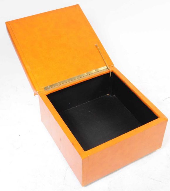 Sherbourne - A mid 20th century Sherbourne leather ottoman pouffe / sewing box. The pouffe of square form, with hinged lid to top opening to reveal storage to interior. Featuring button detail to top, upholstered in orange leather. Measures approx. 33x52x52cm