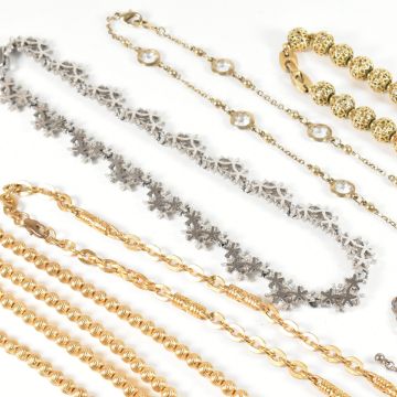 A collection of vintage and modern costume necklaces. The lot to include a rolled gold crucifix on yellow tone metal chain. A Ciro yellow tone metal necklace green glass oval links. A Monet yellow tone metal filigree beaded necklace. To also include a necklace with large medallion pedant with dollar sign and a necklace with pendant in the form of a apple. Combined weight 673.3g. Measures approx 48cm / 150cm. All weights, measurements and sizes are approximate.