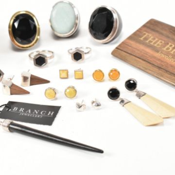 A collection of contemporary designer jewellery by 'The Branch jewellery'. The lot to include three gem set wood silver mounted rings, a silver mounted 18k gold plated cuff bangle. To also include seven pairs of earrings with some stamped 925 and being gem set of having wood accents. Combined weight 188.7g. Measures 7.5cm x 6cm/ 0.5cm x 1cm. All weights, measurements and sizes are approximate.
