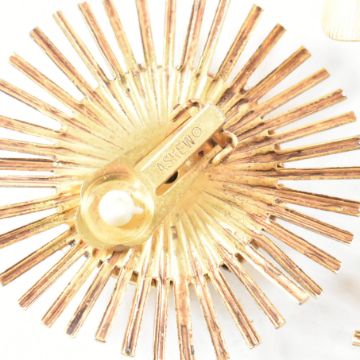 A 1980'S Vintage Askew London Brooch and pair of earrings. The lot to include a pair of  gold tone clip on earrings in the form of sunflowers and gem set to the centre. A gold tone brooch of spiral form and set with three white stones. Both being stamped with makers mark for Askew London.  Combined weight 55.4g. Measures 4.5cm diameter / 7cm x 4cm. All weights, measurements and sizes are approximate.