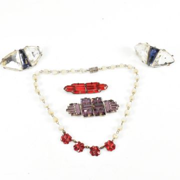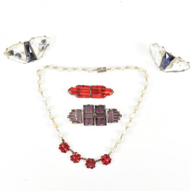 A collection of paste, Vauxhall glass and mother of pearl jewellery. The jewellery to include four buckles, a horseshoe brooch pin, a four leaf clover and mother of pearl necklace. Necklace measures approx 40cm, brooch 5cm. All weights, measurements and sizes are approximate.