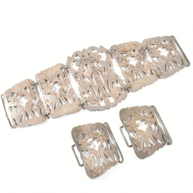 A collection of Edwardian EPNS nurse's belts. The lot to include a EPNS nurse's belt with pierced and etched links to a central hook clasp. An EPNS nurse's belt with pierced links and a central buckle with vacant cartouche. The belt having a hook clasp to the back. A silver plate nurse's belt with cast links to pierced central buckle. A section of an EPNS nurse's belt with pierced and etched links with foliate design. Sold as seen, missing the front section. Belts measure 63.9-73cm. Section measures 22cm. Total weight 554.2g. All weights, measurements and sizes are approximate.