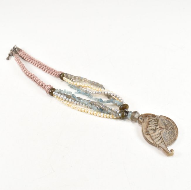 Barbara Acton Bond - A carved nephrite jade pendant necklace. The necklace strung with a nephrite jade carved pendant strung with cultured pearl, aquamarine and  labradorite beads to a plaited silk cord with toggle clasp. Measures 45cm. All weights, measurements and sizes are approximate.