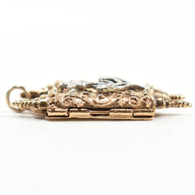 A hallmarked 9ct gold Torah scroll necklace pendant with opening doors. The 9ct yellow gold Jewish necklace pendant two doors decorated with white gold Menorah and Star of David that open out to reveal an inscription of the ten commandments in Hebrew. The religious pendant hallmarked for London, 1992. Sponsor's mark FM. Measures 4.2cm x 2cm. Weighs 11.8g. All weights, measurements and sizes are approximate.