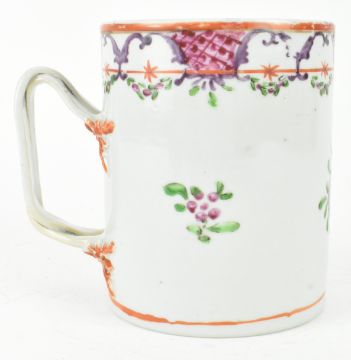 A Qing Qianlong period (1736–1795) porcelain famille rose tankard. The tankard decorated with vignettes and scrolls of flowers under the mouth rim, sprigs of flowers on the body with twisted handle. Measures approx. 13cm tall x 15cm diameter including the handle.