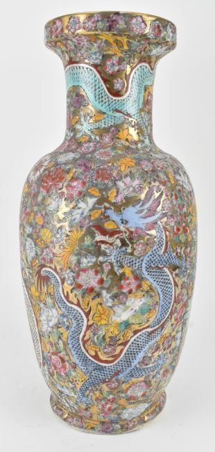 A 20th century famille rose "Dragon" vase. The baluster shaped vase has a gold ground decorated with five dragons on the body surrounded by flowers throughout. Four characters "Qianlong" mark to the base. Measures approx. 46cm tall.